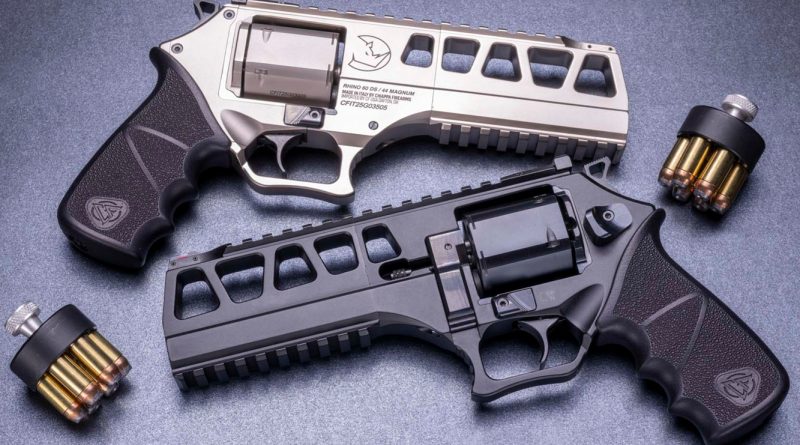 Az olasz Armi Chiappa “alulcsöves” Rhino revolvere a furcsa külseje és magas ára ellenére kifejezetten sikeres holmi, hiszen tudja azt, amit ígér: nagyon lecsökkenti a hátrarúgás felfele csavaró nyomatékát. Az eddigi közepes tokméretre épülő .38 Special/.357 Magnum, 9 mm Luger és 10 mm AUTO után itt az új, nagy tokméretű .44 Remington Magnum, 6-lövetű kivitel is!
