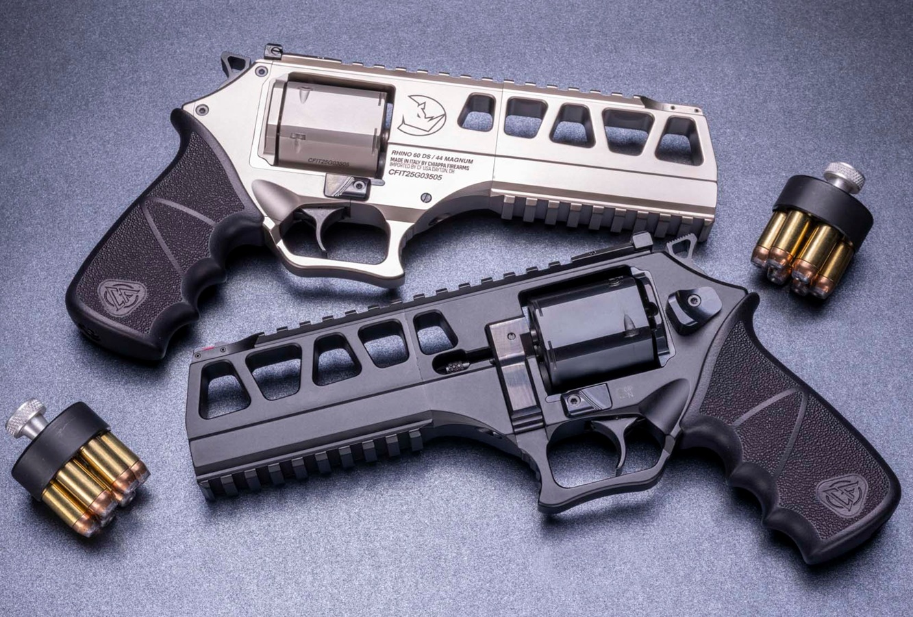 Az olasz Armi Chiappa “alulcsöves” Rhino revolvere a furcsa külseje és magas ára ellenére kifejezetten sikeres holmi, hiszen tudja azt, amit ígér: nagyon lecsökkenti a hátrarúgás felfele csavaró nyomatékát. Az eddigi közepes tokméretre épülő .38 Special/.357 Magnum, 9 mm Luger és 10 mm AUTO után itt az új, nagy tokméretű .44 Remington Magnum, 6-lövetű kivitel is!