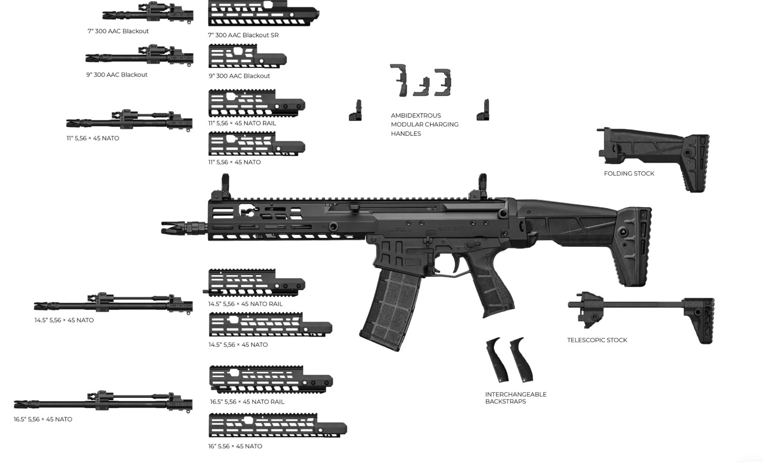- 5,56×45 mm NATO és .300 BLK kaliberben gyártják, 7,62×39 mm nincs (egyelőre?).