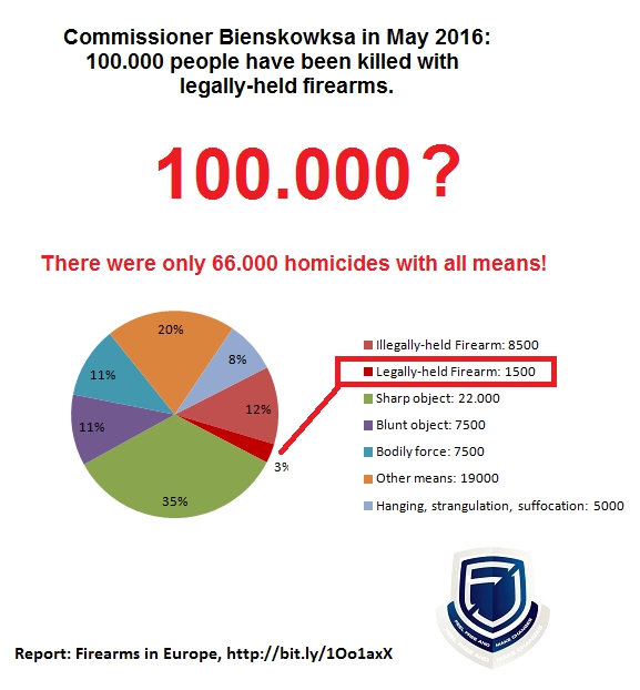 Elżbieta Bieńkowska az Európai Bizottság tagja az Európai Parlament előtt azzal indokolta nemrég a Bizottság fegyverbetiltási javaslatát, hogy “az utóbbi évtizedben 100 ezer embert öltek meg az EU-ban” legálisan tartott félautomata fegyverekkel.
