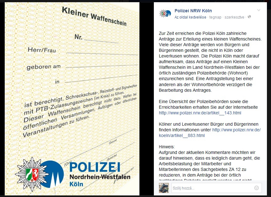 Ismét egy olyan dolog történt Németországban, ami Magyarisztánban a sci-fi-be sem fér bele, inkább fantasy. Az ismert nők elleni támadások kapcsán a kölni rendőrség a facebook-oldalán a gáz-riasztó fegyverre szóló viselési engedélyek (Kleiner Waffenschein, KWS) kiadásában nyújt segítséget a polgároknak. Mint írják, az igénylések száma erősen megnövekedett, de sokan nem a megfelelő helyi hivatalban adják be a kérelmet.