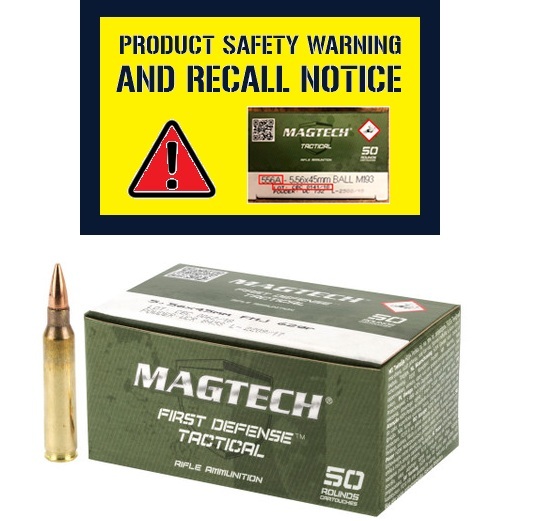 A MagTech brazil lőszergyártó bejelentette, hogy hibás lőportöltet miatti balesetveszély okán visszahívja az 5,56×45 mm (556A jelzésű) FMJ-lövedékes lőszerének három, tavaly gyártott sorozatát is: