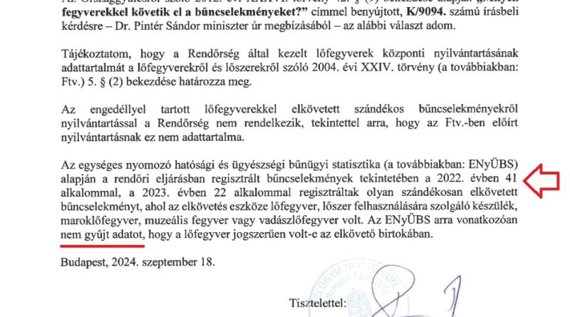 2. Teljesen zavaros a válaszban a “lőfegyver, lőszer felhasználására szolgáló készülék, maroklőfegyver, muzeális fegyver, vadászlőfegyver”, ez jogilag értelmezhetetlen, hiszen a maroklőfegyver, vadászlőfegyver azok nyilván lőfegyverek, a muzeális fegyver viszont nem lőfegyver. Jogilag olyan kategória meg nincsen, hogy “lőszer felhasználására szolgáló készülék”, hiszen az maga a lőfegyver.