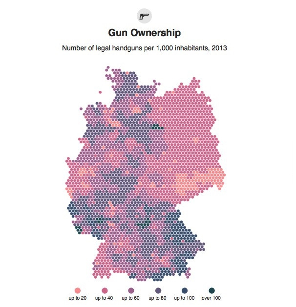 A Zeit.de a német újraegyesítés kapcsán közölt egy érdekes inforgrafikát közölt a 2013-ban legálisan tartott lőfegyverek eloszlásáról a Szövetségi Köztársaságban. Érdekes látni, hogy az egykori Nyugat-Németországot több mint húsz év után sem érték be az egykori NDK lakói.
