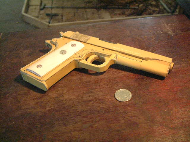Az alábbi videón a fegyverbetiltók igazi rémálma látható. Egy amerikai úriember papírból hajtogat-ragaszt fegyvermásolatokat, nagyszerű élethűséggel. Most odáig ment, hogy Colt M1911 másolata valóban lőképes, igaz, csupán papírgalacsin a lövedék, melyet gyufafejekről lekapart hajtóanyaggal ló ki, .45 ACP csappantyúzott hüvelyekre alapozva.