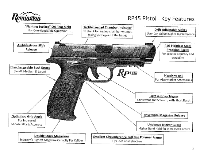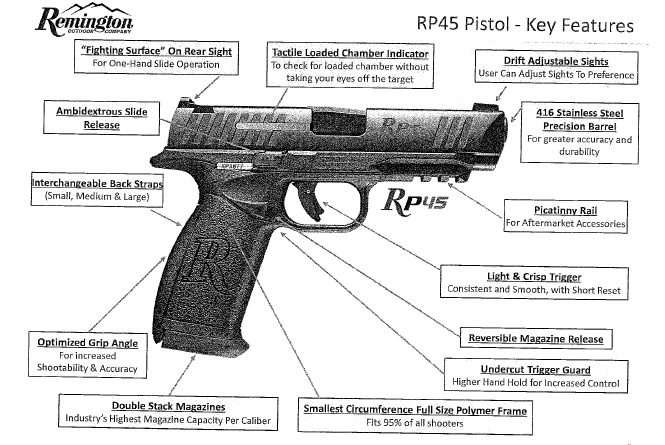 A Remington a tegnapi hírünkben szereplő Rohrbaugh-átirat RM380 zsebpisztoly után várhatóan egy szolgálati méretű, műanyagtokos Browning-SIG reteszelésű öntöltőt is piacra dob, RP45 néven. A .45 ACP kaliberű fegyver tárkapacitása 14 db lőszer lesz, amihez a legkeskenyebb markolatot, ami kapható, hirdetnek. A fegyverről csak ez, a viszonteladóknak szánt szóróanyag fénymásolata található meg, de ennél is gyanús, hogy a szán Walther PPQ a tok pedig FN FNX-45 photoshop. Érdekesség még, hogy a neten fellelhető kész hirdetéseken megtévesztésként az FN egyik pisztolya került a helyére.