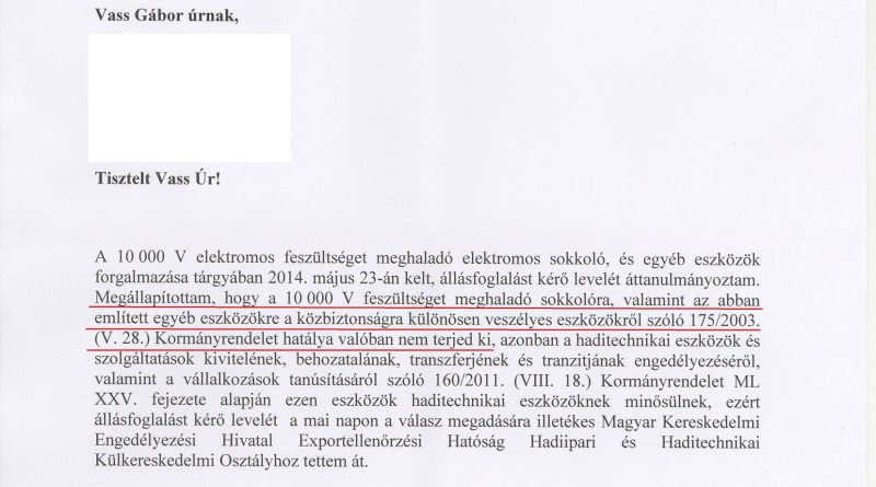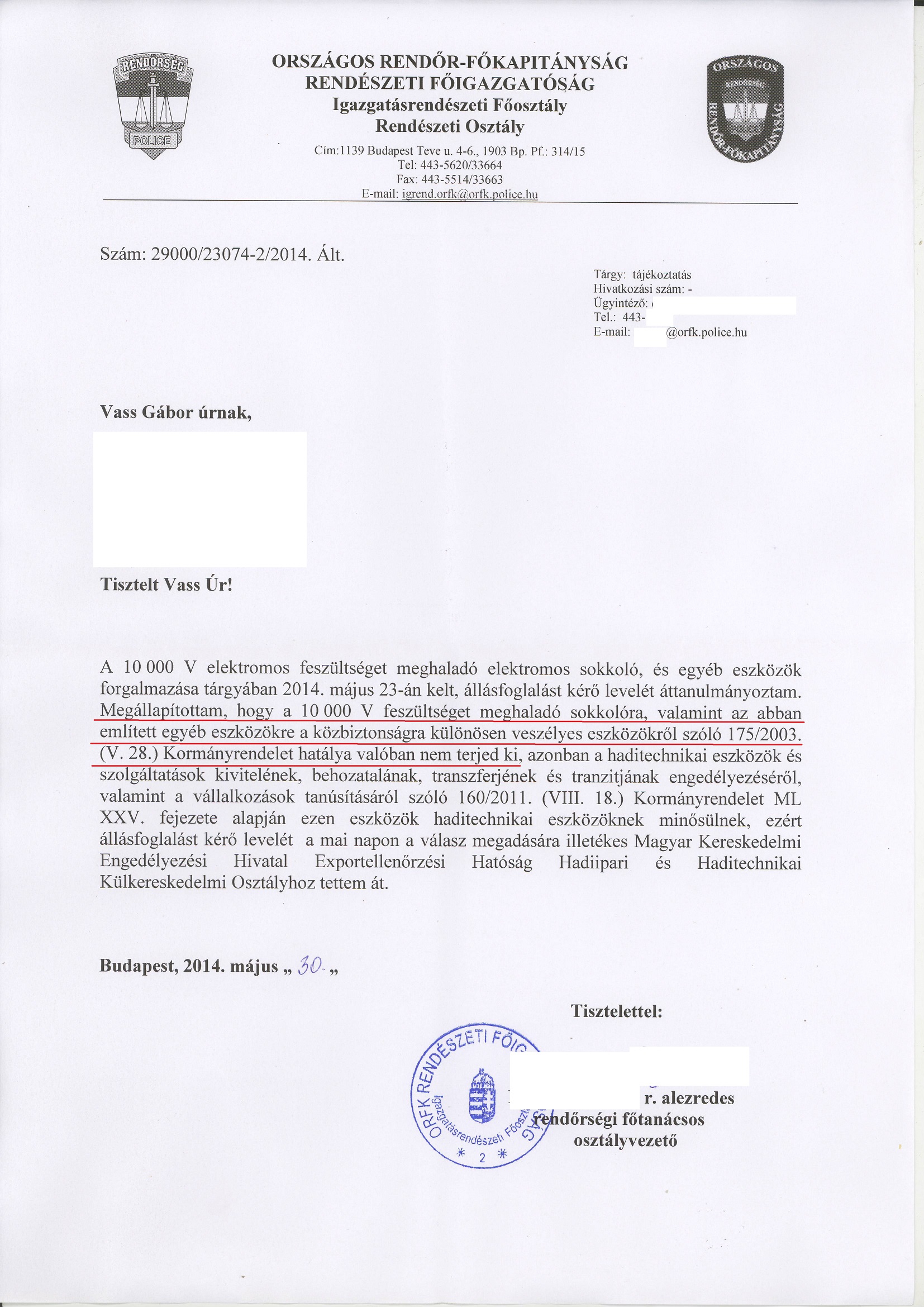A fenti csatolt képen olvasható dokumentum értelmében az ORFK 29000/23074-2/2014 Ált. állásfoglalásában osztotta azon jogi véleményünket, hogy a hatályos jogszabályok alapján a 10 ezer voltot meghaladó feszültségre képes elektromos sokkoló eszközök nem tartoznak a Közbiztonságra Különösen Veszélyes Eszközökről (KKVE) szóló kormányrendelet hatálya alá.