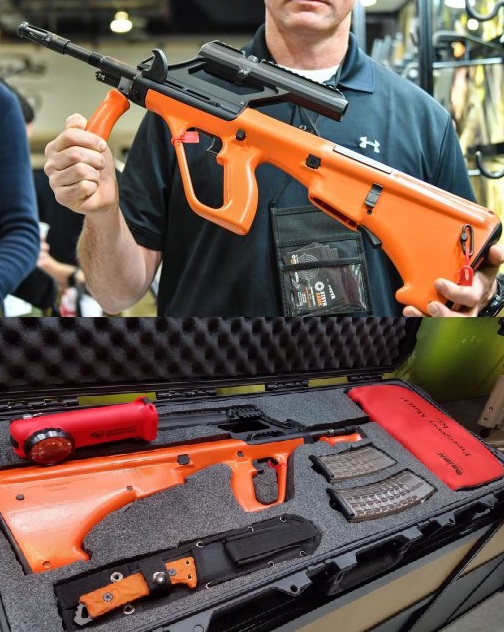 Az osztrák Steyr-Mannlicher idén ünnepli az AUG bullpup gépkarabély rendszeresítésének 40. évfordulóját. Ehhez kapcsolódóan limitált kiadásokat is bemutatnak a fegyver csak öntöltő, polgári kiviteléből. Ezek közül talán a legérdekesebb, legfurcsább, a “Survival Kit”, melynél az 5,56×45 mm-es AUG A3 műanyagtokja narancssárga (“emergency orange”) és egy jókora műanyagkofferben, egy túlélőkészlettel együtt kap helyet.