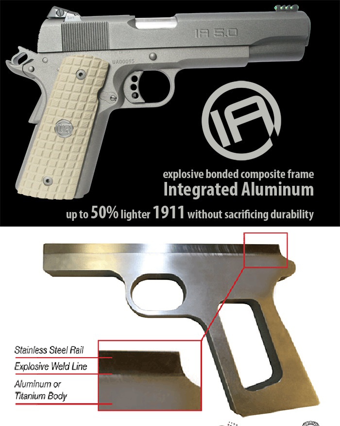 Az amerikai UA Arms (Tennesse) újszerű megoldást mutatott be az M1911 tokok gyártásában. Eddig ugye ha fémtokos volt az M1911, akkor ha acélból volt akkor tartós, de nehéz, ha pedig alutokos volt, akkor könnyű, de hamar tönkrement. Ők most egy EBM (Explosive Bonded Metals) fedőnevű plazmahegesztési technológiával olyan tokot hoznak létre, mely alul alumínium vagy titán, felül, a vezetőléceknél pedig rozsdamentes acél. Így az alap acéltokos pisztolyhoz képest 40-60% tömegcsökkenést érnek el. A .45 ACP kaliberű pisztolyok 5″, 4,25″ és 3,5″ csőhosszal készülnek, árukat tekintve 2000+ dollárról beszélünk.