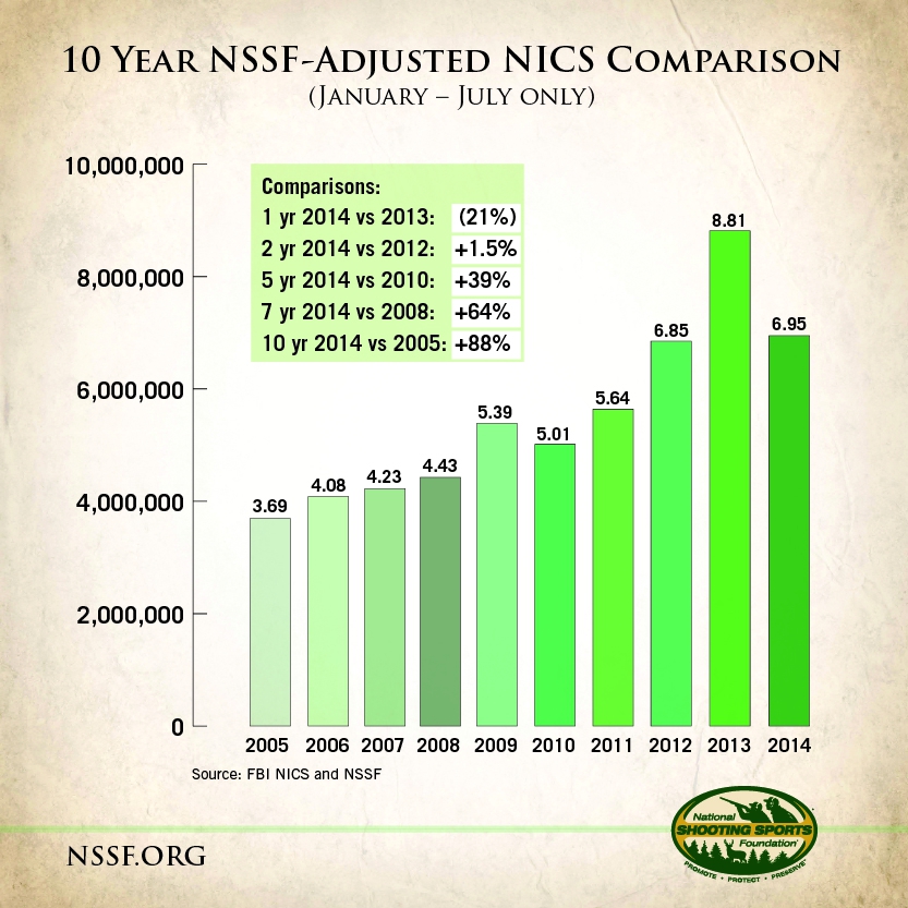 Amint a grafikonból is látható, az idei év első 7 hónapjában az USA-ban visszaesett az előző évihez képest a kiskereskedelmi fegyvereladások száma az előző évihez képest. Megjegyzendő, hogy ez még így is 6,95 millió darab, és a kiugró 2013-as év előttiek átlagát messze veri. A visszaesés inkább normalizálódás, hiszen tavaly a kormányzati (szövetségi és állami) fegyverbetiltó törekvésektől való félelem pánikszerű felvásárlásokhoz vezetett. Nem véletlen, hogy Barack Obamát az év fegyverbolti eladójaként is emlegetik.