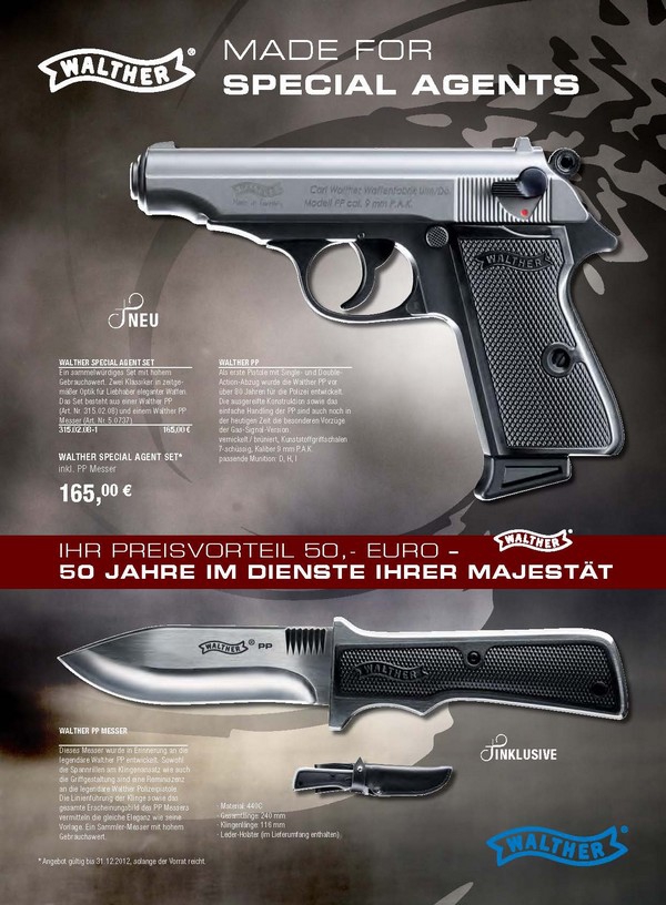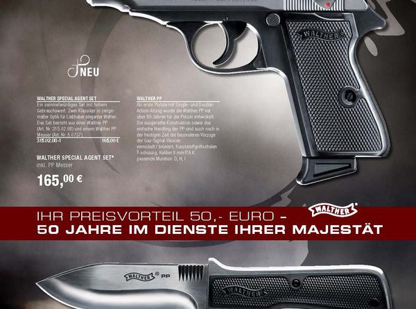 Az Umarex az új Skyfall James Bond-filmhez kapcsolódva 1000 darabos limitált szériában mutatta be az Umarex Walther PP gázpisztoly nikkelezett szános kivitelét, melyhez a szettben egy 116 mm pengehosszúságú (banánisztánban nem sünbarát) fix pengés kés és annak tokja is jár. A kés markolata designjában a PP markolathéjait idézi, a penge anyaga 440C acél. A gázpisztoly műszakilag teljesen azonos a normál PP gázpisztollyal, 9 mm PAK kaliberű, tárkapacitása 7+1. A szett ára kompletten 165 euró Németországban.